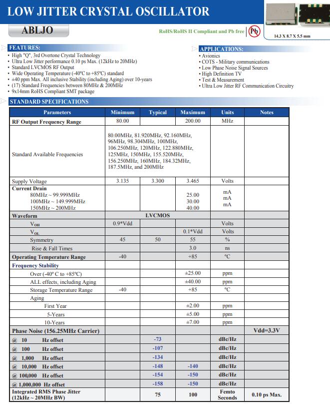 ABRACON旗艦ABLNO系列提供超低相位噪聲固定時(shí)鐘或電壓控制晶體振蕩器(VCXO)解決方案標(biāo)準(zhǔn)尺寸為9x14mm。同超過12 kHz的37fs典型RMS抖動20MHz帶寬@ 100MHz載波,ABLNO是性能驅(qū)動的理想選擇通訊,射頻,無線回程,和儀器應(yīng)用。