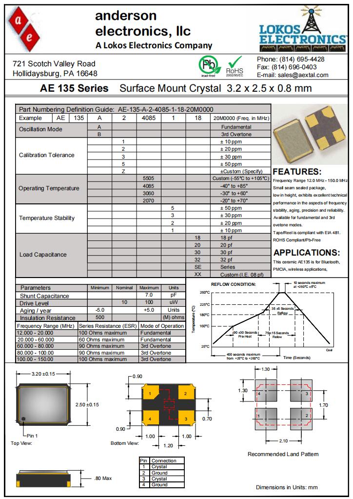 美國安德森晶振|AE-135-A-1-4085-2-20-18M4320|3225mm晶振,美國安德森晶振,AE135石英晶振,進口晶振,AE-135-A-1-4085-2-20-18M4320晶振,無源晶振,晶體諧振器,四腳貼片晶振,3225mm晶振,頻率18.432MHz,負載20pF,工作溫度-40~85°C,頻率容差10pm,小體積晶振,高精度晶振,高可靠性晶振,PMCIA晶振,無線應用晶振,藍牙耳機晶振,筆記本電腦晶振.