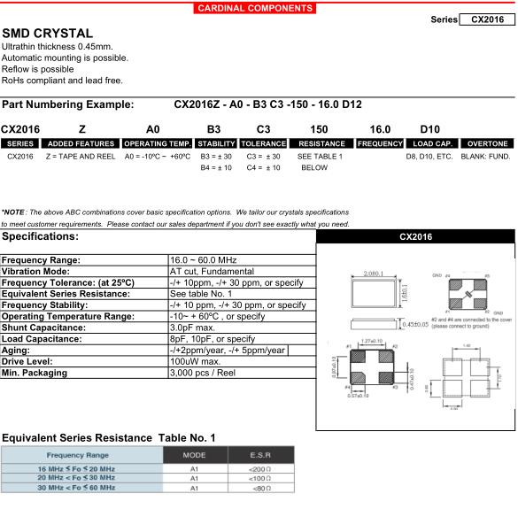 更多>>美國(guó)卡迪納爾晶振,CX2016貼片諧振器,CX2016Z-A0-B4C4-150-16.0D12晶振