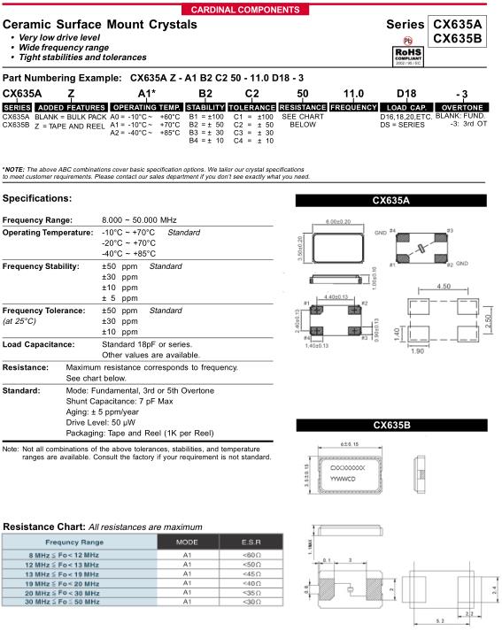 更多>>Cardinal卡迪納爾晶振,CX635A無源四腳晶振,CX635AZ-A2B3C350-11.0D18-3晶振