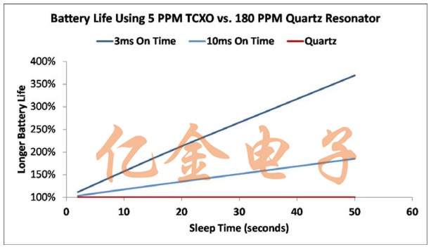 基于MEMS的SiT1552 TCXO晶振在溫度范圍內(nèi)頻率變化小于5ppm,是一個很大的問題比石英晶體更準確的替代品.這種精確度減少了開啟時間并允許系統(tǒng)保持睡眠模式.使用SiT1552晶振,系統(tǒng)設計人員可以利用壓縮和傳輸數(shù)據(jù)僅在需要時短暫爆發(fā),同時保持設備處于最低功耗睡眠狀態(tài)以進行延長周期并可能達到電池續(xù)航時間的兩倍.圖7顯示增加與180ppm 32.768kHz石英晶體相比,使用5ppm 32.768KHz TCXO可獲得電池壽命諧振器.