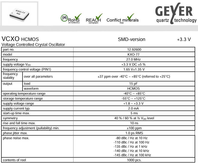 With the model designation KXO-77, we have expanded our VCXO (voltage controlled oscillator) portfolio and are the first to offer a 27 MHz oscillator with a low current consumption of 2 mA max.
