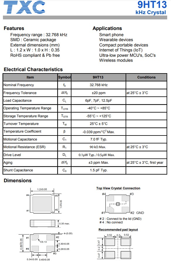 TXC CRYSTAL是臺灣晶技晶振的簡寫,更多時候我們直接簡稱為TXC晶振,臺灣晶技晶振是一家領(lǐng)先的頻率控制元件制造商,其生產(chǎn)的9HT13系列,編碼9HT13-32.768KDZF-T,石英晶體諧振器,頻率32.768k晶振,超小型尺寸1.2x1.0x0.35mm陶瓷封裝,四腳貼片晶振,符合RoHS標(biāo)準(zhǔn),無鉛,應(yīng)用于智能手機(jī),可警告設(shè)備,緊湊型便攜式設(shè)備,物聯(lián)網(wǎng),超低功耗MCU和SoC,無線模塊