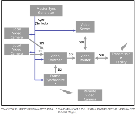 專業(yè)攝像機是工作室制作的核心,其性能依賴于精確的同步。以下是同步在典型攝像機設(shè)置中的級聯(lián)方式: