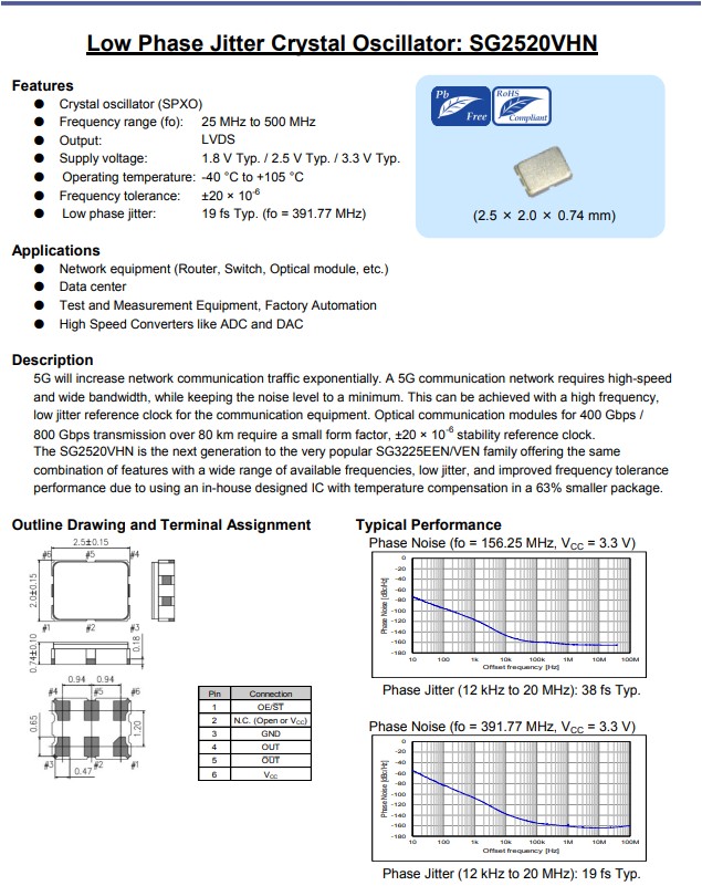 愛普生晶振SG2520VHN是非常受歡迎的SG3225EEN/VEN系列的下一代產(chǎn)品,提供相同的功能組合,具有廣泛的可用頻率、低抖動和更高的頻率容差性能,因為它采用了內(nèi)部設(shè)計的溫度補償IC,封裝尺寸減小了63%。SG2520VHN有源晶振支持LVDS輸出差分晶振,工作溫度可達到-40℃至+105℃,電源電壓1.8V至3.3V,寬頻率范圍25MHz至500MHz任意一頻點具有低電源電壓,滿足產(chǎn)品低消耗電流特點,具有超小型,輕薄型,低電源電壓,低抖動,低功耗,低損耗,低耗能,低相位噪聲等特點,被廣泛用于通訊設(shè)備,機頂盒,光端機,安防設(shè)備及各種頻率控制設(shè)備上。 應(yīng)用于5G網(wǎng)絡(luò)設(shè)備專用晶振X1G005941000215,X1G005941001115,差分晶振