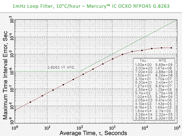 對于基于數(shù)據(jù)包的同步,振蕩器的中期穩(wěn)定性要求是關(guān)鍵。傳統(tǒng)上,傳輸設(shè)備過去需要 Stratum 3 級穩(wěn)定性,以支持系統(tǒng)中 0.1Hz 至 10Hz 的環(huán)路帶寬?;?Packet 的 clocks 具有低得多的帶寬,為了滿足整個工作溫度范圍內(nèi)的 wander 生成指標(biāo),需要更穩(wěn)定的振蕩器。Rakon 與基于數(shù)據(jù)包的算法供應(yīng)商合作,測試振蕩器的各種環(huán)路帶寬,并對其進(jìn)行調(diào)整以滿足標(biāo)準(zhǔn)要求。下面顯示了使用 Rakon 振蕩器在 1mHz 下完成的 MTIE 測試,該振蕩器符合標(biāo)準(zhǔn)掩碼。