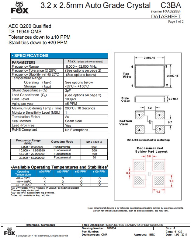 | FC3BACAGI17.0-T3 | Fox 晶振 | C3BA | 17 MHz | ±100ppm | ±30ppm | 12pF | -40°C ~ 125°C |