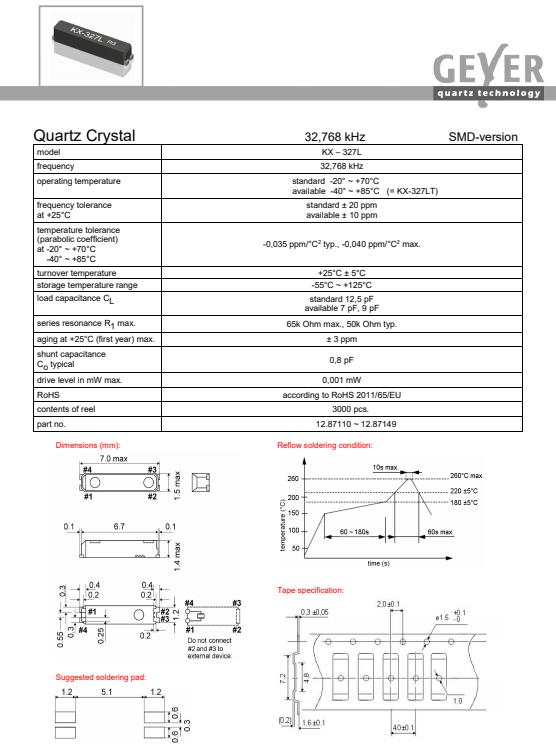 更多>>格耶晶振,KX-327L貼片晶振,12.87110~12.87149無源晶振