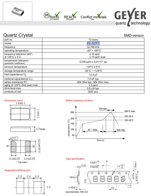 GEYER晶振,KX–327FT無(wú)源晶體,32.768K晶振,貼片表晶32.768K系列千赫晶體KHZ具有超小型,薄型,質(zhì)地輕的表面貼片音叉型石英晶體振蕩器,晶振產(chǎn)品本身具備優(yōu)良的耐熱性,耐環(huán)境特性,在辦公自動(dòng)化,家電領(lǐng)域,移動(dòng)通信領(lǐng)域可發(fā)揮優(yōu)良的電氣特性,符合無(wú)鉛標(biāo)準(zhǔn),滿足無(wú)鉛焊接的回流溫度曲線要求,金屬外殼的石英晶振使得產(chǎn)品在封裝時(shí)能發(fā)揮比陶瓷晶振外殼更好的耐沖擊性能.
