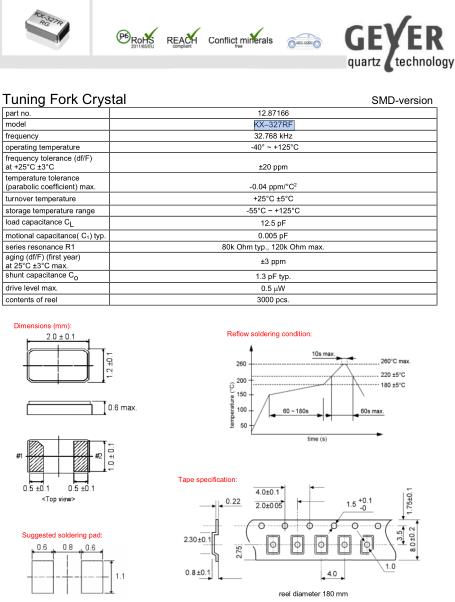 德國(guó)格耶晶振,KX-327RF貼片晶振,12.87166晶振,貼片表晶32.768KHZ晶振系列具有超小型,薄型,質(zhì)地輕的表面貼片音叉型石英晶體振蕩器,晶振產(chǎn)品本身具備優(yōu)良的耐熱性,耐環(huán)境特性,在辦公自動(dòng)化,家電領(lǐng)域,移動(dòng)通信領(lǐng)域可發(fā)揮優(yōu)良的電氣特性,符合無(wú)鉛標(biāo)準(zhǔn),滿(mǎn)足無(wú)鉛焊接的回流溫度曲線要求,金屬外殼的石英晶振使得產(chǎn)品在封裝時(shí)能發(fā)揮比陶瓷晶振外殼更好的耐沖擊性能.