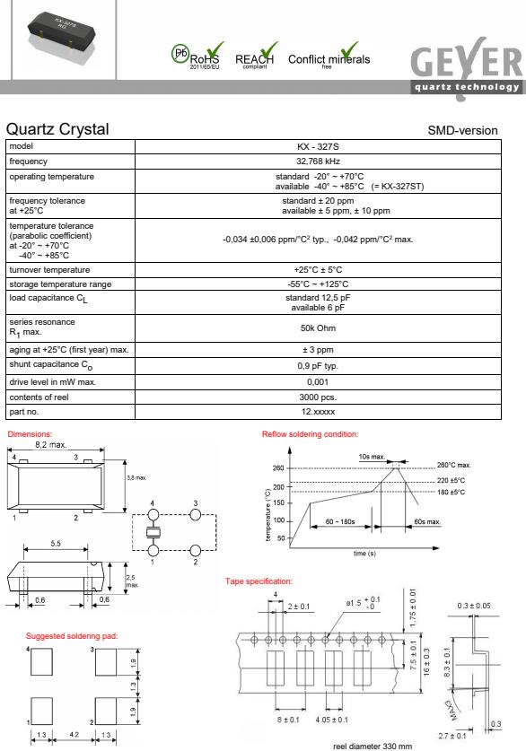 GEYER格耶晶振,KX-327S無源晶體,8038mm貼片晶振,32.768KHZ晶振時鐘晶體具有小型,薄型,輕型的貼片晶振表面音叉型晶體振蕩器,產品具有優(yōu)良的耐熱性,耐環(huán)境特性,可發(fā)揮晶振優(yōu)良的電氣特性,符合RoHS規(guī)定,滿足無鉛焊接的高溫回流溫度曲線要求,金屬外殼的封裝使得產品在封裝時能發(fā)揮比陶瓷振蕩器外殼更好的耐沖擊性.