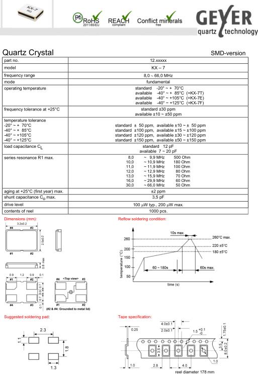 standard -20° ~ + 70°C available -40° ~ + 85°C (=KX-7T) available -40° ~ +105°C (=KX-7E) available -40° ~ +125°C (=KX-7F) |