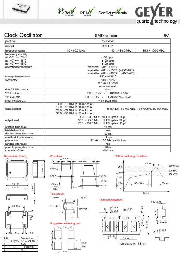 standard -20° ~ +70°C available -40° ~ +85°C (=KXO-97T) available -40° ~ +105°C (=KXO-97E) |