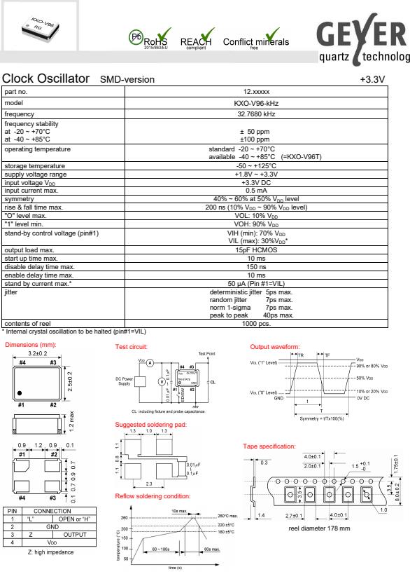 GEYER進口晶振,KXO-V96-kHz低抖動晶振,時鐘振蕩器,小體積SMD時鐘振蕩器,是貼片音叉晶體,千赫頻率元件,應用于時鐘模塊,智能手機,全球定位系統(tǒng),因產(chǎn)品本身體積小,SMD編帶型,可應用于高性能自動貼片焊接,被廣泛應用到各種小巧的便攜式消費電子數(shù)碼時間產(chǎn)品,環(huán)保性能符合ROHS/無鉛標準.