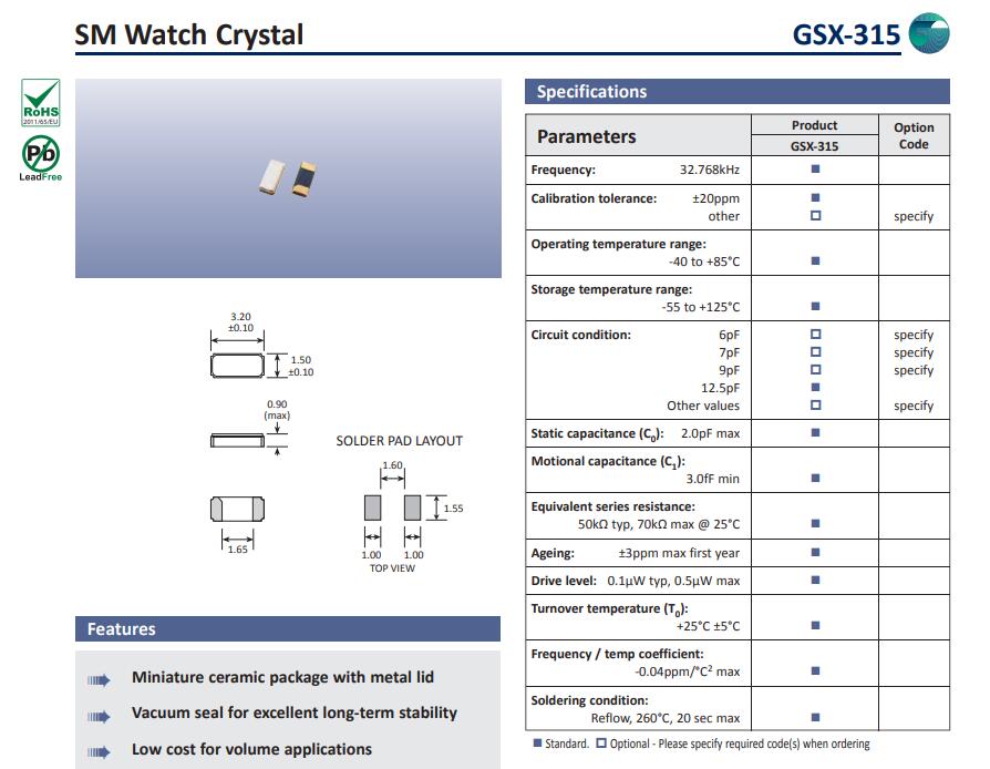 Golledge晶振,GSX-315晶振,3215無源晶振小體積SMD時鐘晶體諧振器,是貼片音叉晶體,千赫頻率元件,應(yīng)用于時鐘模塊,智能手機(jī),全球定位系統(tǒng),因產(chǎn)品本身體積小,SMD編帶型,可應(yīng)用于高性能自動貼片焊接,被廣泛應(yīng)用到各種小巧的便攜式消費電子數(shù)碼時間產(chǎn)品,環(huán)保性能符合ROHS/無鉛標(biāo)準(zhǔn).