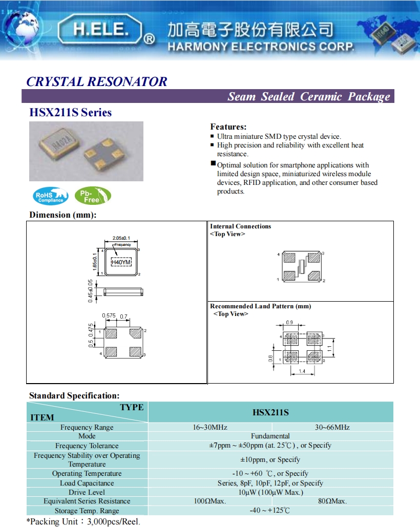 | X2C016000BA1HA-U | HELE晶振 | HSX211S | 16MHz | 10pF | ±10PPM | ±20PPM |