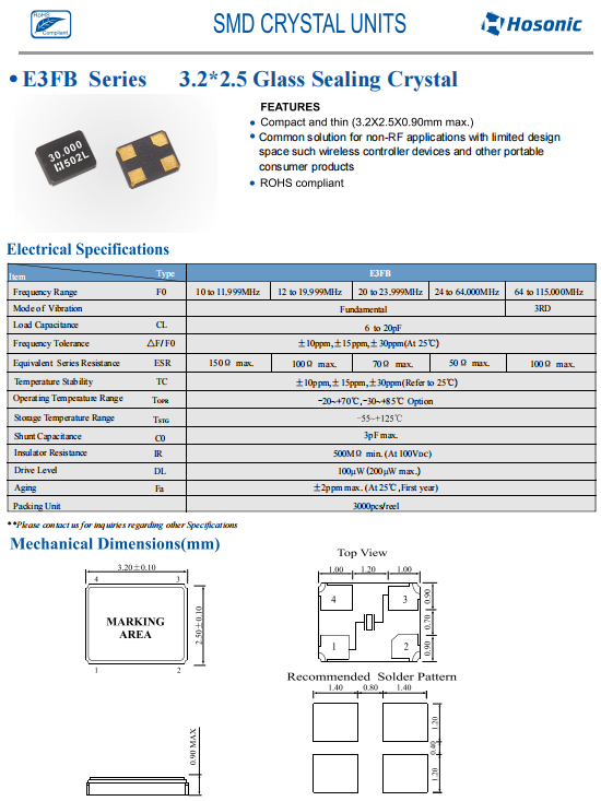 | E3FB17.0000F18E33 | Hosonic晶振 | E3FB | 17MHz | 18pF | ±30ppm | ±30ppm | 3.2 x 2.5 x 0.8 mm |