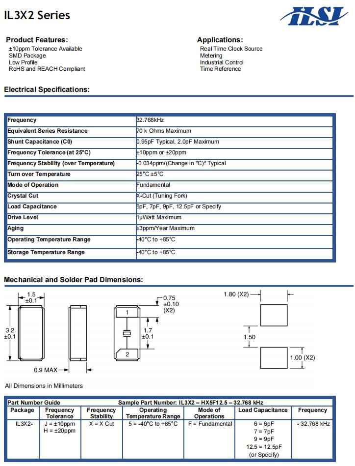 | IL3X2-HX5F12.5- 32.768 KHz | ILSI | IL3X2 | -40°C ~ 85°C | 32.768 kHz | ±20ppm | 12.5 pF |