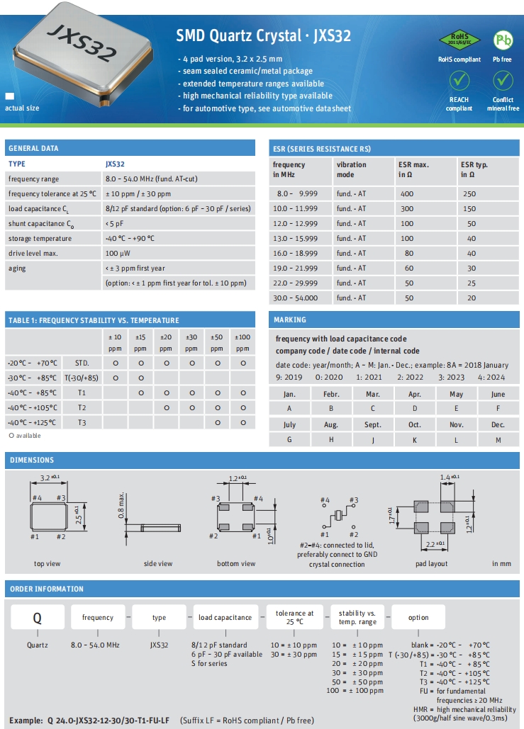 | Q 24.0-JXS22-10-10/10-FU-WA-LF | Jauch晶振 | JXS22-WA | 24MHz | ±10ppm | 10pF | -20°C ~ 70°C |