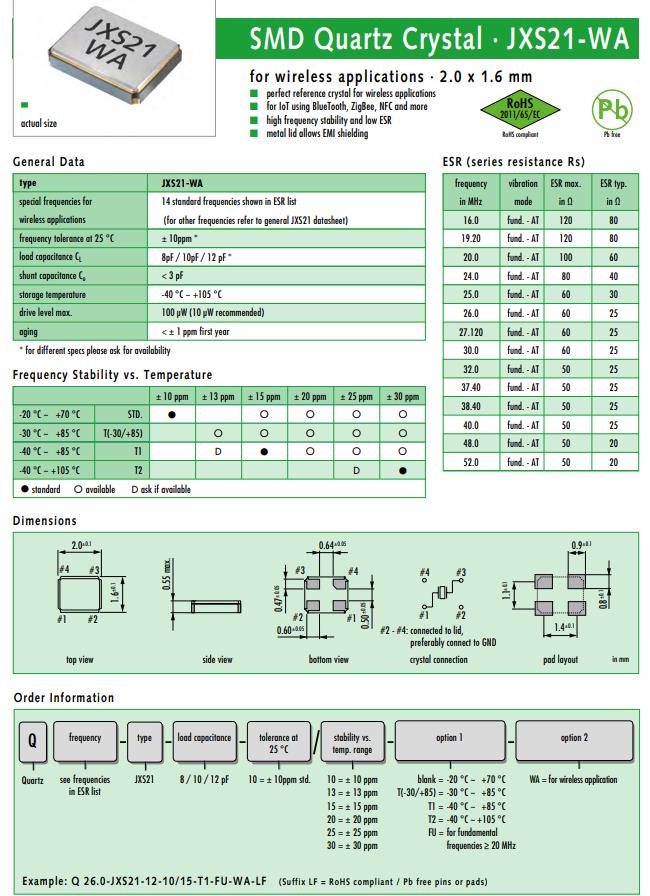 | Q 26.0-JXS21-9-10/10-FU-WA-LF | Jauch晶振 | JXS21-WA | 26MHz | ±10ppm | 9pF |
