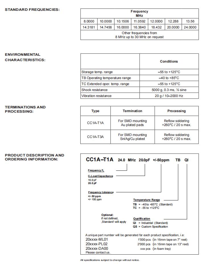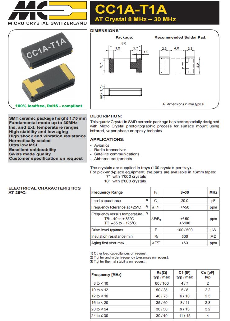 Micro進(jìn)口晶振|CC1A-T1A-18.000MHz-20.0pF-100ppm-TA-QI|6G無線通信晶振規(guī)格表
