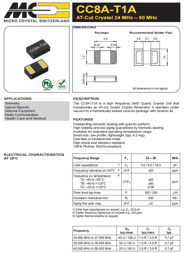 CC8A-T1A-25.000MHz-9.0pF-50ppm-TA-QI,6G基站晶振,高頻貼片石英晶體特點: