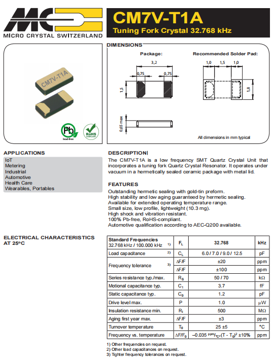 CM7V-T1A32.768kHz12.5pF±20ppmTBQA|6G路由器晶振|瑞士微晶晶振規(guī)格表