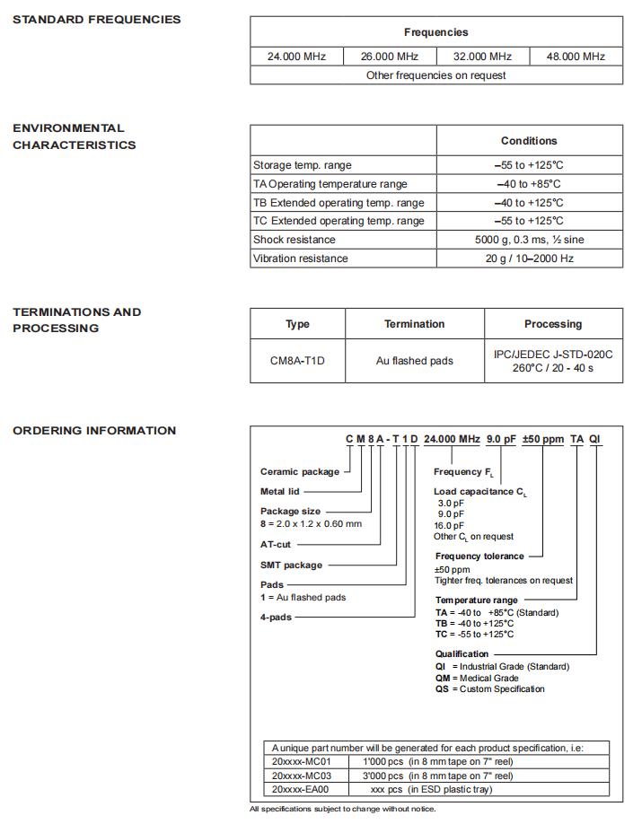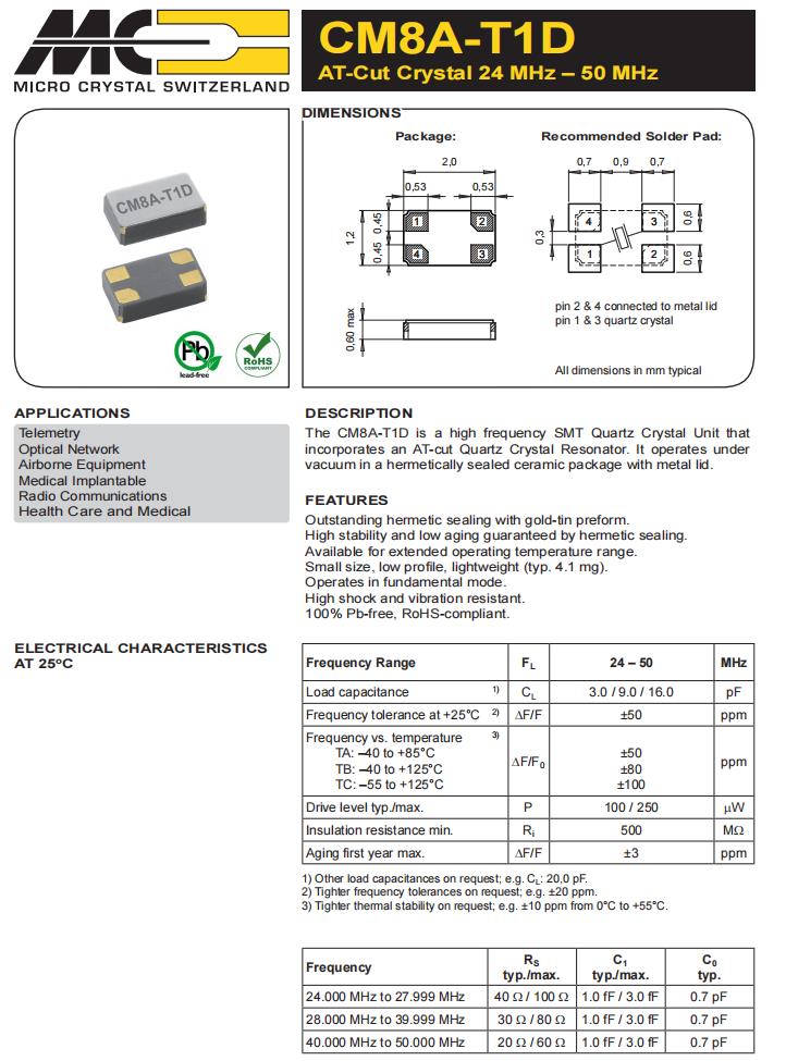CM8A-T1D-27.000MHz-16.0pF-50ppm-TB-QI|2012四腳貼片晶振|6G光纖通道晶振,瑞士微晶晶振,CM8A-T1D石英晶體諧振器,CM8A-T1D-27.000MHz-16.0pF-50ppm-TB-QI晶振,2012四腳貼片晶振,頻率27MHz,負載16pf,頻率穩(wěn)定性50ppm,工作溫度-40~125°C,低老化振,高可靠性晶振,6G光纖通道晶振,醫(yī)用植入式晶振,無線電通信設(shè)備晶振,家用保健和醫(yī)療設(shè)備晶振.