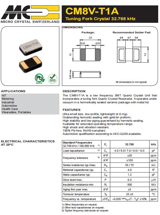 | CM8V-T1A-32.768kHz-9pF-100PPM-TA-QC | Micro Crystal | 晶體 32.768 kHz 9.0 pF +/-100 PPM -40/+85C |