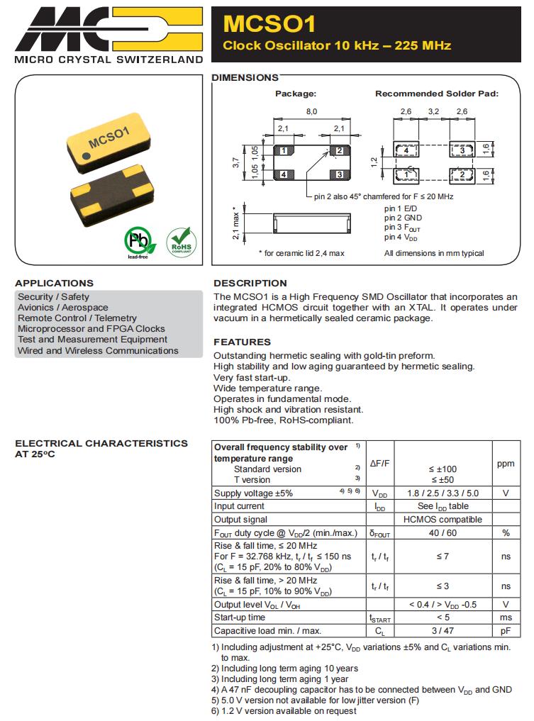MCSO1CHVT-B-32.000MHz-E/D-T3,6G路由器晶振,高頻貼片振蕩器,瑞士微晶晶振,MCSO1進(jìn)口有源晶振,MCSO1CHVT-B-32.000MHz-E/D-T3晶振,8037mm晶振,高頻貼片振蕩器,頻率32MHz,電壓3.3V,頻率穩(wěn)定性50ppm,工作溫度-40~85°C,無鉛環(huán)保晶振,低老化晶振,6G路由器晶振,安保應(yīng)用晶振,航空電子晶振,微處理器晶振,測試和測量設(shè)備晶振.