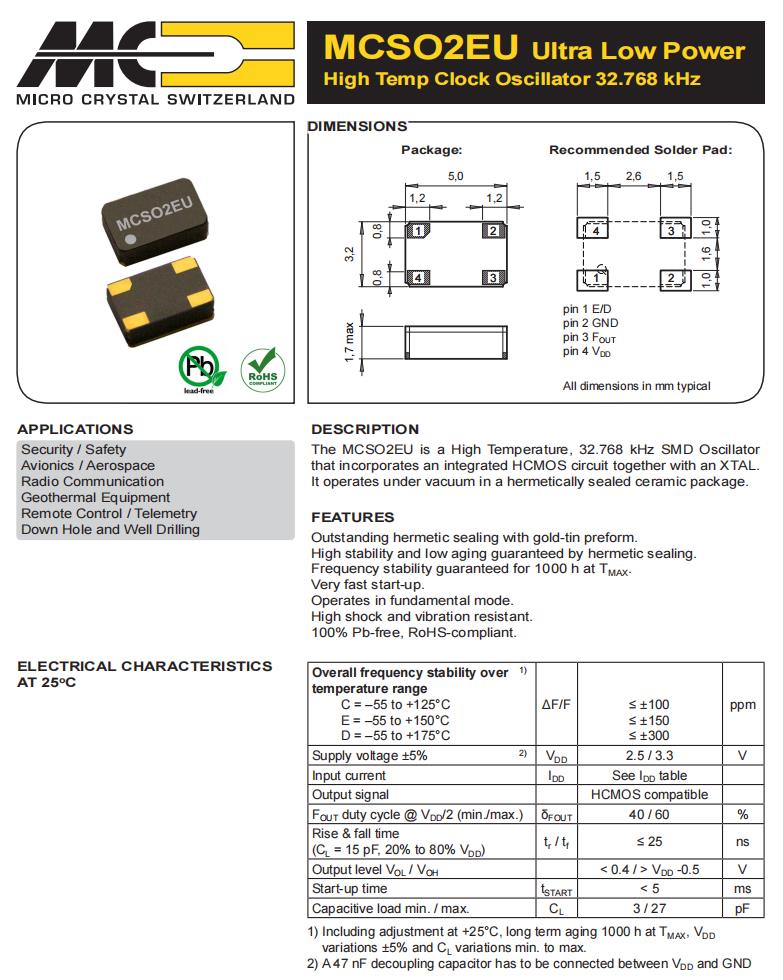 MCSO2EUV-D-32.768kHz-E/D-T3,5032mm晶振,6G基站晶振,Micro晶振,MCSO2EU石英晶體振蕩器,MCSO2EUV-D-32.768kHz-E/D-T3晶振,5032mm晶振,32.768K有源晶振,電壓3.3V,頻率穩(wěn)定性100ppm,工作溫度-55~175°C,抗沖擊晶振,抗振動(dòng)晶振,6G基站晶振,安全設(shè)備晶振,航空航天應(yīng)用晶振,地?zé)嵩O(shè)備晶振,井下和鉆井應(yīng)用晶振,遠(yuǎn)程控制應(yīng)用晶振.