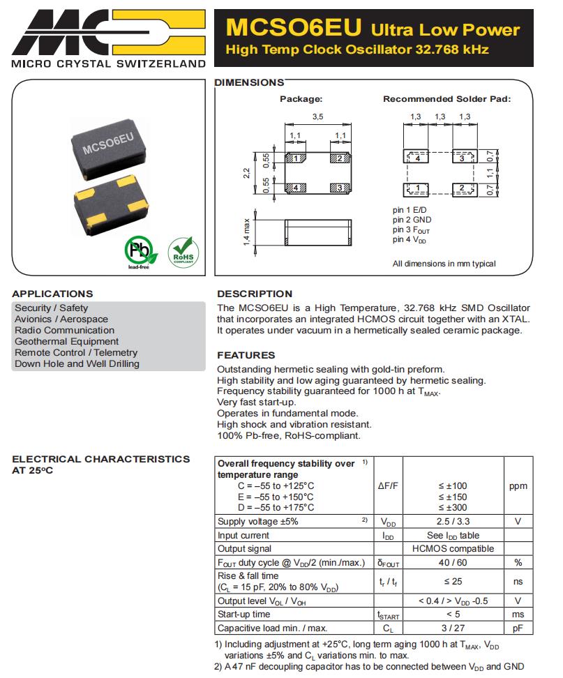 MCSO6EUV-E-32.768kHz-E/D-T3|32.768KHz有源晶振|6G發(fā)射器晶振,Micro晶振,MCSO6EU進(jìn)口晶振,MCSO6EUV-E-32.768kHz-E/D-T3晶振,3522mm晶振,有源晶振,頻率32.768KHz,電壓3.3V,頻率穩(wěn)定性100ppm,工作溫度-55~150°C,耐高溫晶振,低老化晶振,6G發(fā)射器晶振,無(wú)線電通信晶振,安保應(yīng)用晶振,地?zé)嵩O(shè)備晶振,井下和鉆井應(yīng)用晶振.