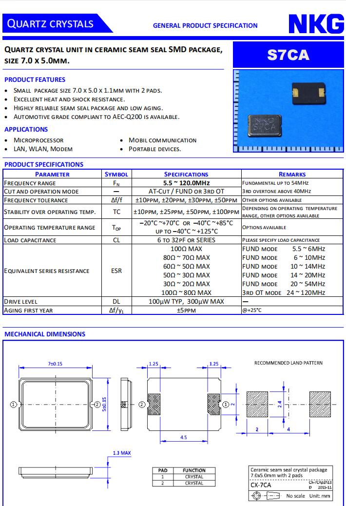 香港NKG晶振|S7CA40.000F20M23-EXT|7050無源晶振規(guī)格表