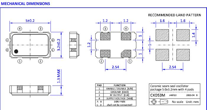 ●SMD封裝尺寸為5.0 x 3.2 x 1.3mm,帶有4個襯墊