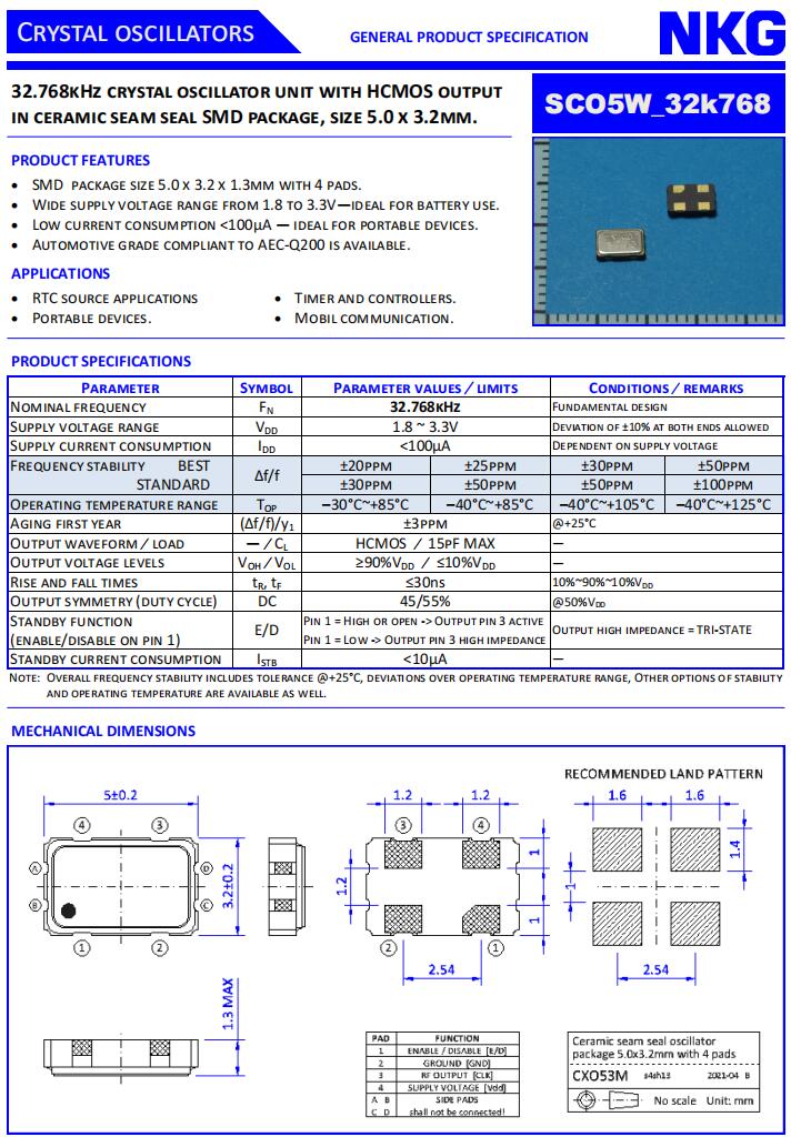 NKG晶振|SCO5W-B-32K768-ZTS-EXT|5032有源晶振規(guī)格表