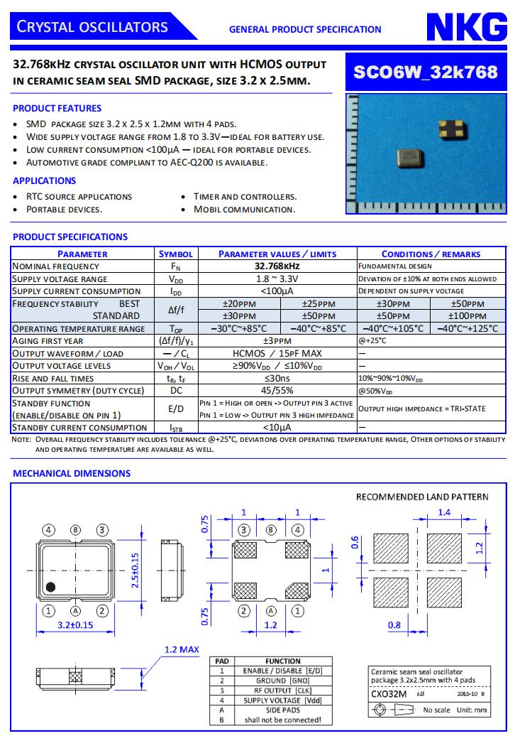 NKG晶振|SCO6W-D-32K768-YTS-EXT|3225音叉晶體規(guī)格表