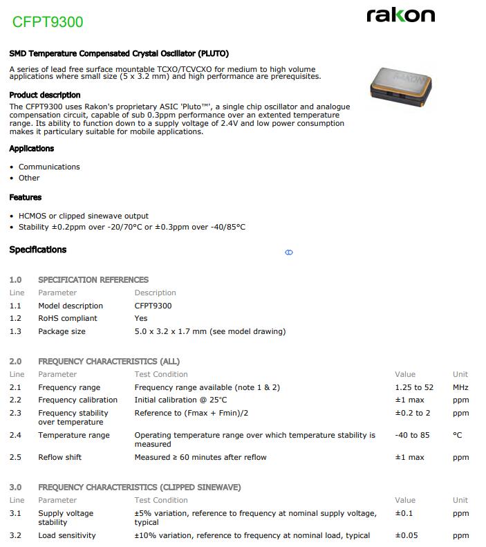 更多>>RAKON晶振,CFPT9300晶振,5032溫補晶振