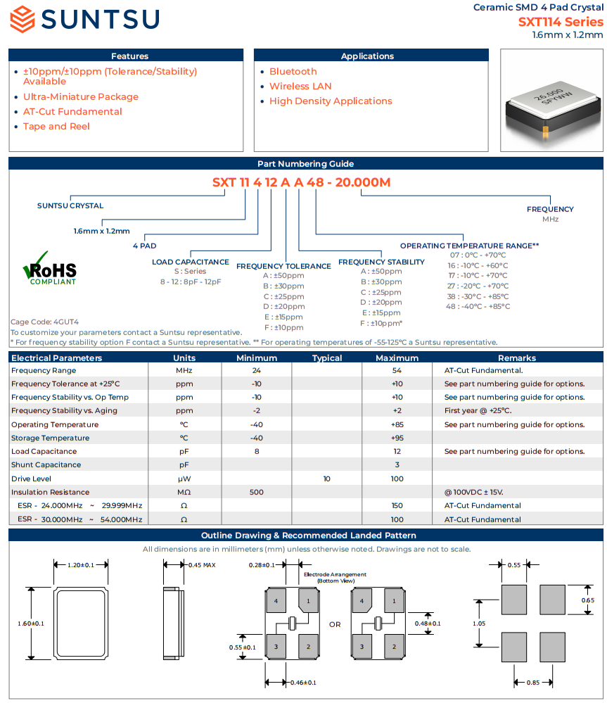 | SXT11410AA48-30.000M | 1.6X1.2 SMD (4 PAD) CRYSTAL | 10pF | ±50ppm | 30.000M |