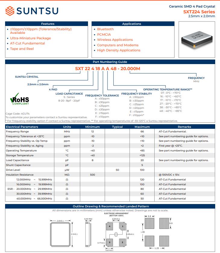 | SXT22410AA07-48.000M | 2.5X2.0 SMD (4 PAD) CRYSTAL | 10pF | ±50ppm | 48.000M |
