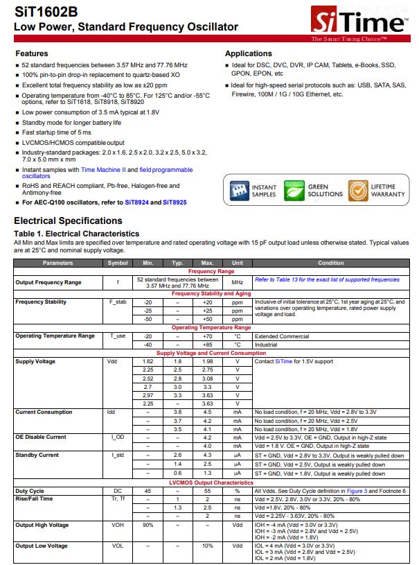 SiTime晶振,SiT1602B系列晶振,LVCMOS/HCMOS兼容輸出晶振