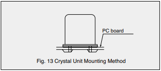 (3)安裝引線型晶振晶體單元時,我們建議設(shè)備應(yīng)與PC聯(lián)系電路板和焊接方式,以防止疲勞和由于機(jī)械共振引起的引線斷裂(見圖。13)。