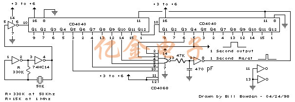 使用50Khz晶振時,當(dāng)加起來50000的相應(yīng)計數(shù)器位全部為高時,檢測到50000的計數(shù).這對應(yīng)于位15(32768)+14(16384)+9(512)+8(256)+6(64)+4(16).位14和15是第二計數(shù)器的第3和第4級,位0是第一計數(shù)器(Q1,引腳9)的第一級.要使用100Khz晶體,每個位將向右移動一次,因此總數(shù)將為(65536+32768+1024+512+128+32=100,000).使用1Mhz晶體,需要以下位: 在1Mhz時,有源晶體振蕩器電路中的330K電阻需要按比例減小到大約15K.當(dāng)達(dá)到終端計數(shù)時,在NAND門之后的施密特觸發(fā)器反相器級產(chǎn)生7μS復(fù)位脈沖.47K電阻和470皮法電容維持輸出,使計數(shù)器可靠地復(fù)位為零.這在50Khz時不到一個時鐘周期,并且不會引入錯誤,但在1MHz時會達(dá)到7個周期,這將導(dǎo)致計數(shù)器每秒丟失7微秒的時間.這不是一個錯誤(百萬分之七),但它會存在.4040 CMOS計數(shù)器的最小復(fù)位脈沖寬度約為1.5uS,因此復(fù)位脈沖不能短得多.