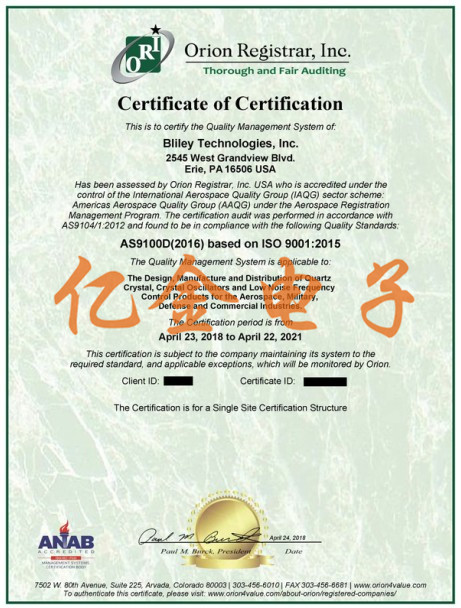 Bliley晶振的Erie工廠于2018年2月獲得認證,展示了完全記錄并實施的質(zhì)量管理體系,該體系已通過AS9100:2016標準認證.