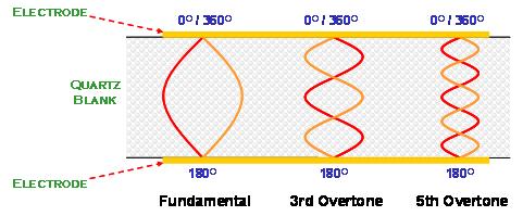 在AT切割角度的石英晶體共振子主要是以厚度剪切振蕩模態(tài)存在. 石英晶體在共振時, 除了基本波振蕩之外, 高階的倍頻共振也與基本波振蕩同時存在于石英晶體的電極區(qū)域之間. 但是, 由于壓電材料的電極是電氣相位相反的振動環(huán)境, 所以, 祇有奇數(shù)倍(odd number)的高頻倍頻可以發(fā)生, 偶數(shù)倍(even number)的倍頻共振在石英晶體共振子是不會存在的(左圖).