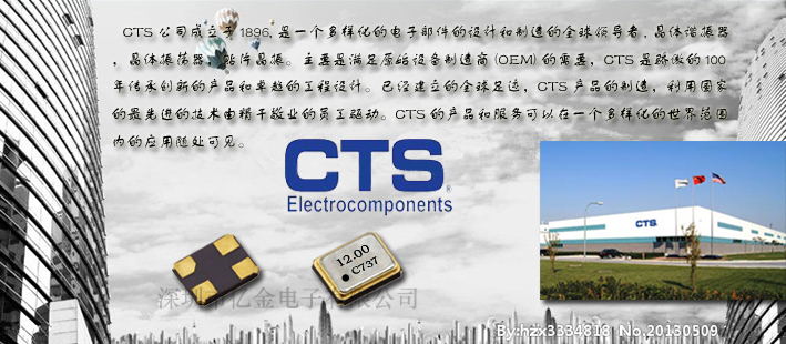 CTS是一家集晶體的研發(fā)、生產(chǎn)、銷售為主的晶振廠家.在美國與中國大陸均設(shè)有生產(chǎn)據(jù)點(diǎn),營業(yè)與銷售據(jù)點(diǎn)包括臺灣臺北、美國、歐洲以及中國大陸等地,客戶遍及汽車產(chǎn)業(yè)、消費(fèi)性電子、信息產(chǎn)業(yè)、通信產(chǎn)業(yè)與通信基礎(chǔ)產(chǎn)業(yè).泰藝電子多年來致力于研發(fā)創(chuàng)新,部分核心技術(shù)是業(yè)界的領(lǐng)先者,近年來陸續(xù)取得石英相關(guān)制造技術(shù)專利;未來將持續(xù)加強(qiáng)開發(fā),以成為全球石英頻控元件領(lǐng)導(dǎo)者之目標(biāo)邁進(jìn).