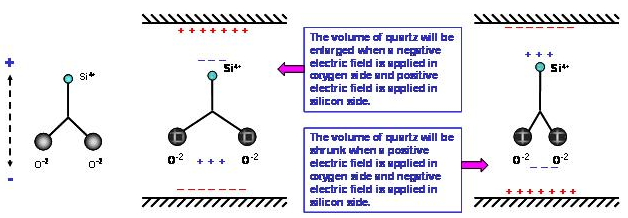 石英材料中的二氧化硅分子(SiO2) 在正常狀態(tài)下, 其電偶極是互相平衡的電中性. 在(圖二左)的二氧化硅是以二維空間的簡化圖形,氧原子的水平位置變化時, 鄰近的另一個氧原子會相對的產(chǎn)生排斥或吸引的力量, 迫使氧原子回到原來的空間位置. 因此, 電場的力量與原子之間的力量會相互牽動, 電場的改變與水平方向的形變是形成交互作用狀態(tài). 這個交互作用會形成一個在石英材料耗能最小的振動狀態(tài), 祇要由電場持續(xù)給與能量, 石英材料就會與電場之間維持一個共振的頻率. 這個壓電效應(yīng)下氧原子的振幅與電場強度及電場對二氧化硅的向量角度有相對應(yīng)的關(guān)系.在實際的應(yīng)用上, 電場是由鍍在石英芯片上的金屬電極產(chǎn)生, 電場與二氧化硅的向量角度則是由石英晶棒的切割角度來決定.