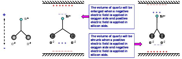 石英材料中的二氧化硅分子(SiO2) 在正常狀態(tài)下, 其電偶極是互相平衡的電中性. 在(如圖)的二氧化硅是以二維空間的簡(jiǎn)化圖形. 當(dāng)我們?cè)诠柙由戏郊把踉酉路椒謩e給予正電場(chǎng)及負(fù)電場(chǎng)時(shí), 空間系統(tǒng)為了維持電位平衡, 兩個(gè)氧原子會(huì)相互排斥, 在氧原子下方形成一個(gè)感應(yīng)正電場(chǎng)區(qū)域, 同時(shí)在硅原子上方產(chǎn)生感應(yīng)負(fù)電場(chǎng)區(qū)域. 相反的情況, 當(dāng)我們?cè)诠柙由戏郊把踉酉路椒謩e給予負(fù)電場(chǎng)及正電場(chǎng)時(shí), 兩個(gè)氧原子會(huì)相互靠近, 氧原子下方產(chǎn)生感應(yīng)負(fù)電場(chǎng),硅原子上方產(chǎn)生感應(yīng)正電場(chǎng).