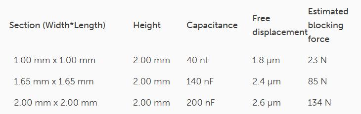 CTS 丹麥高級研發(fā)工程師 Charles Mangeot 先生表示:“由于高密度封裝導(dǎo)致致動機構(gòu)可用空間更小,業(yè)界正在推動更小的壓電致動器。但是小型化對電氣驅(qū)動和安全性造成了限制,因此低電壓操作通常是一個挑戰(zhàn)。我們過去曾生產(chǎn)過小型執(zhí)行器,但通過集中精力改進設(shè)計和工藝,CTS 現(xiàn)在能夠更有效地制造此類產(chǎn)品,并將其提供給廣泛的應(yīng)用和客戶。我們努力突破我們產(chǎn)品的界限,為壓電多層執(zhí)行器提供新的應(yīng)用。” 規(guī)格