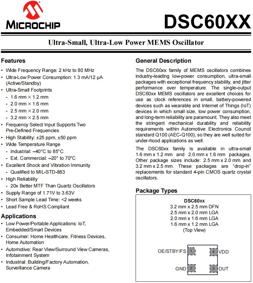 | DSC6001CI2A-004.0000T | Microchip晶振 | DSC60XX | 4MHz | 1.71 V ~ 3.63 V |