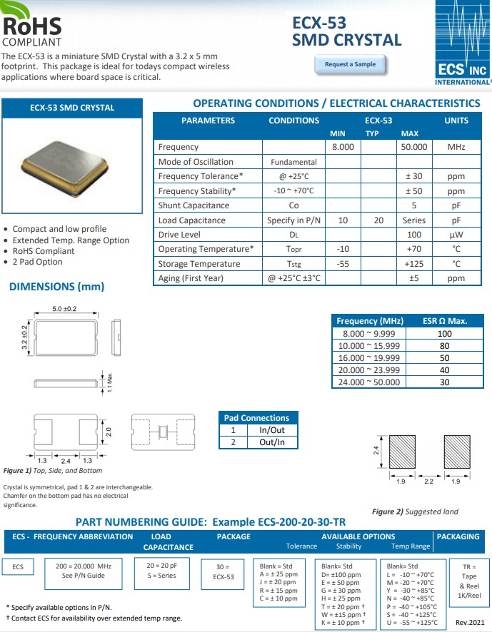 | ECS-250-8-30B-CKM | ECS Crystal | ECX-53B | 25MHz | -20°C ~ 70°C | 4-SMD, No Lead |